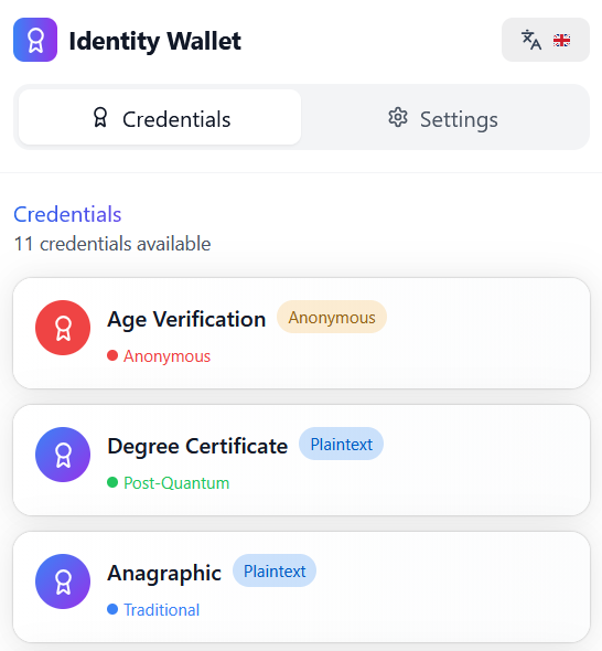Note that plaintext credentials based on traditional cryptography represent a mature technology, widely adopted in different contexts and suitable to a transition to PQC. Nonetheless, credential systems based on plaintext credentials do not protect the privacy of the Holder because the VC with the claim(s) and the signature of the Issuer are exchanged in plaintext. In this sense, plaintext VCs result in linkability and traceability of Holders. For this reason, our wallet also supports the creation of Anonymous Credentials, implemented through the traditional BBS signatures [8] [9]. These credentials allow for the selective disclosure mechanisms, a privacy-preserving alternative that enables the Holder to manage its VC by choosing the level of information to disclose for authentication purposes.